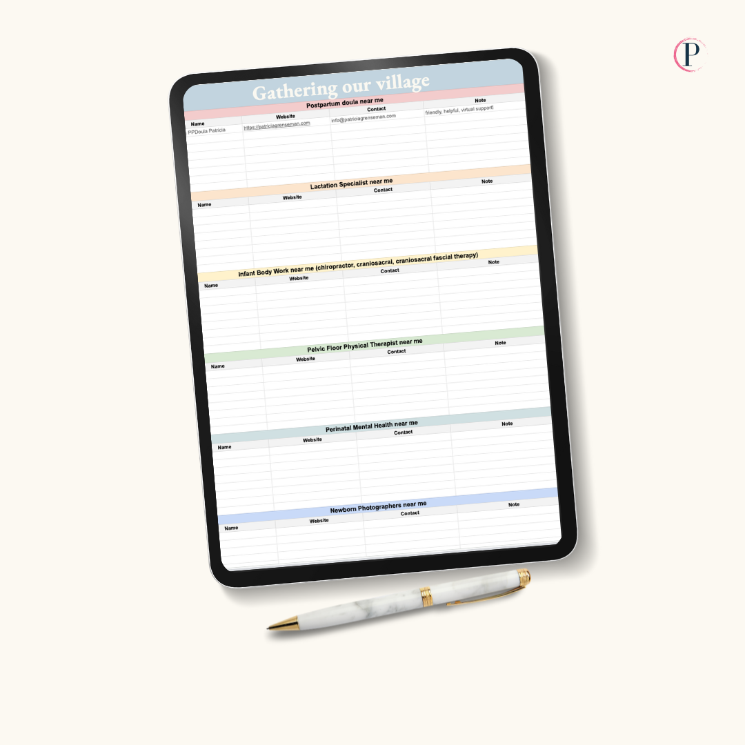 Get the 15-minute video walk through and the beautifully designed sheet to record the postpartum pros, experts, and resources you want to keep on hand for after you meet your baby.