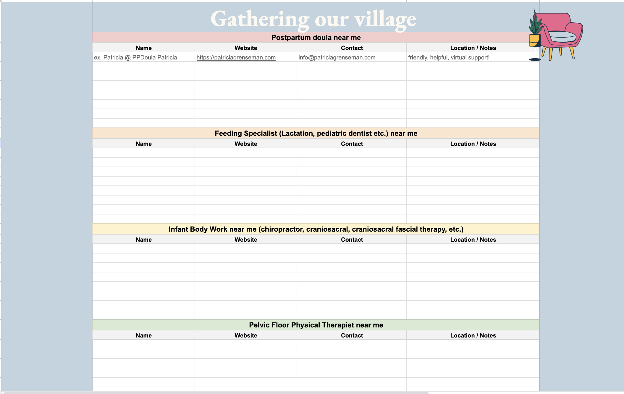 Get the 15-minute video walk through and the beautifully designed sheet to record the postpartum pros, experts, and resources you want to keep on hand for after you meet your baby.
